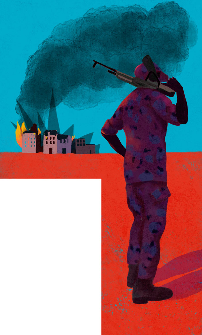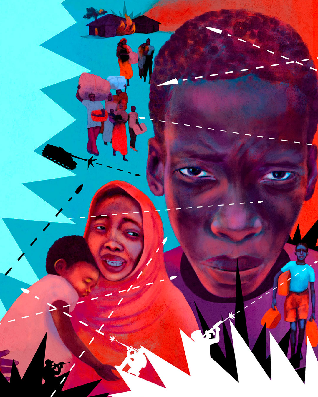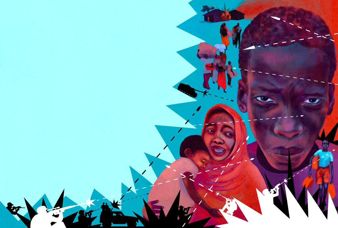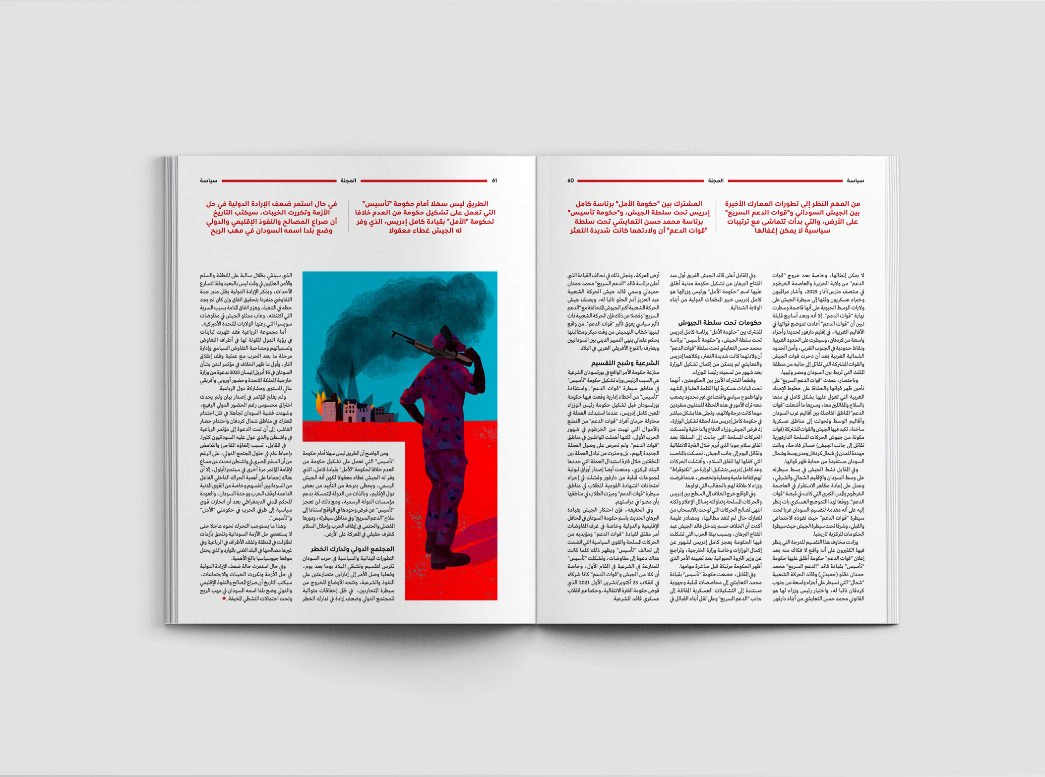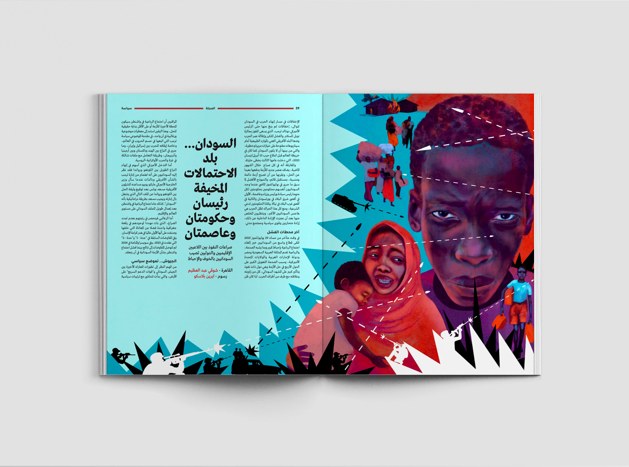 Editorial Sudan, the land of scary possibilities CLIENT: MAJALLA magazineIllustrations about the terrible civil war ravaging the countryAD: Sara LoaneSept 2025